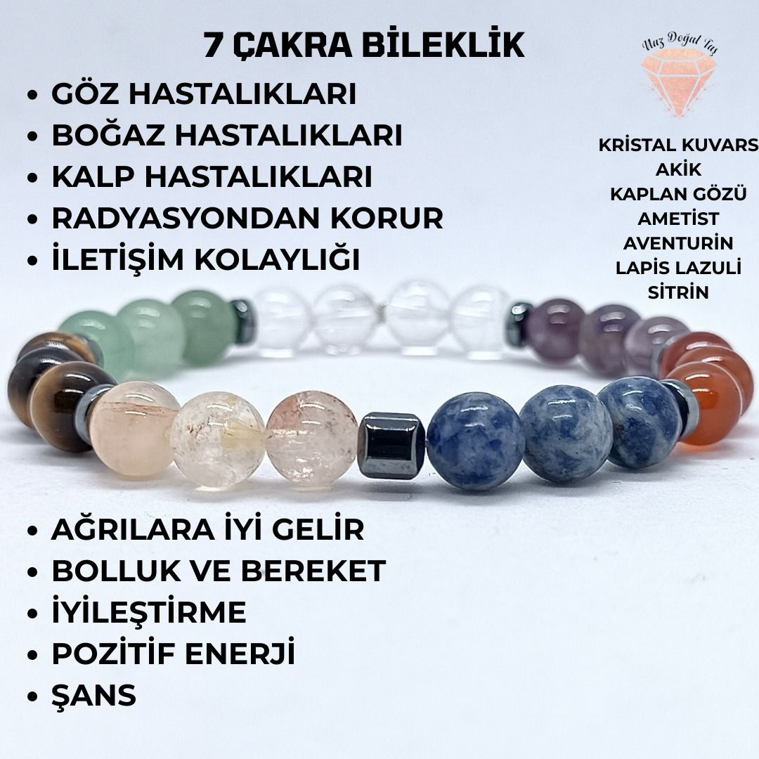 Yedi çakrayı temsil eden ve dengelediğine inanılan doğal taşlarla hazırlanmış özel bileklik. Geleneksel olarak vücudun enerji merkezlerini uyumlu hale getirdiği düşünülür.