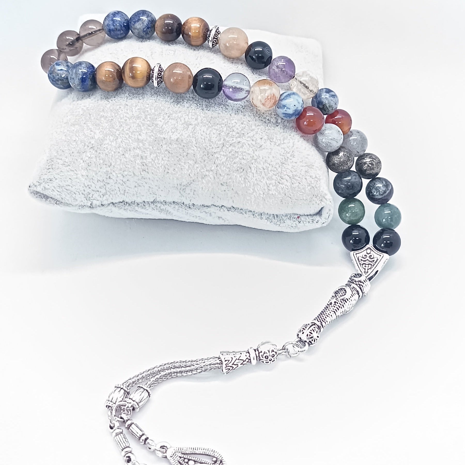 Her bir tane özenle işlenmiş, doğal taşların benzersiz desenlerine sahip bu tesbih,