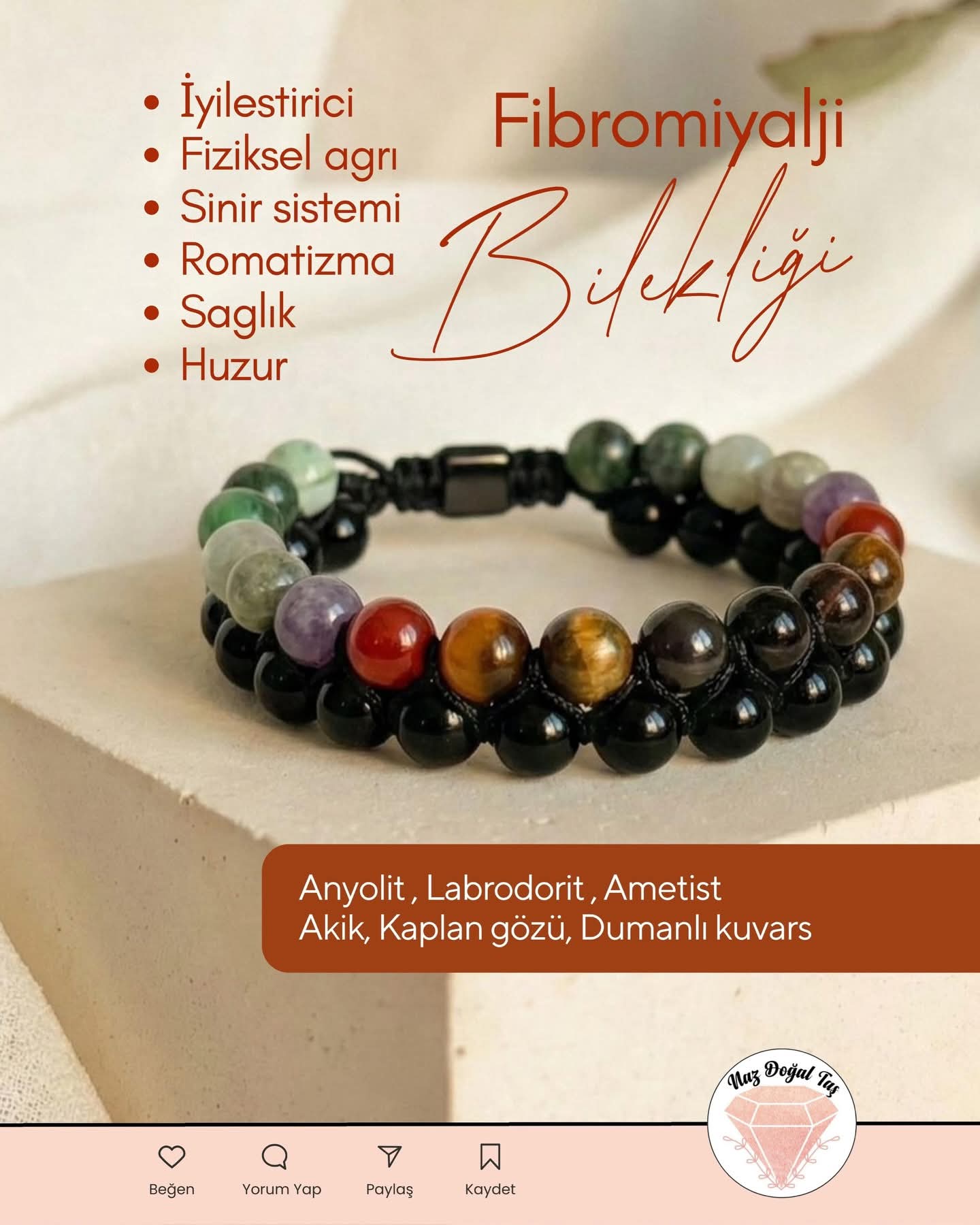 Fibromiyalji ile yaşayanlar için özel olarak tasarlanan bu bileklik, doğal taşların enerji dengeleyici özelliklerinden faydalanarak günlük yaşamınızda size eşlik eder.